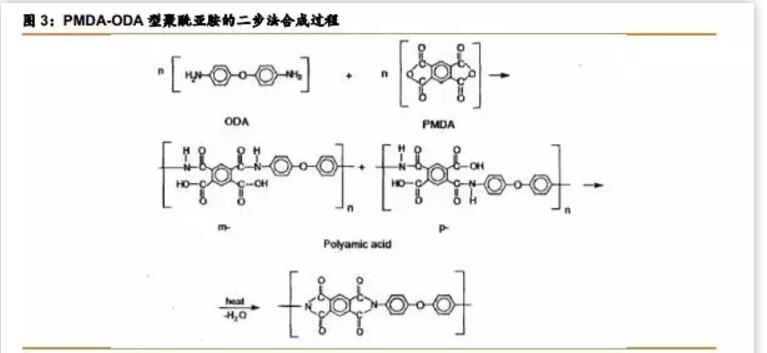 ● 二步法是目前合成聚酰亞胺最普遍采用的方法,包括由二酐和二胺在非質子極性溶劑中低溫縮聚得到前體聚酰胺酸及脫水環化得到聚酰亞胺兩步。